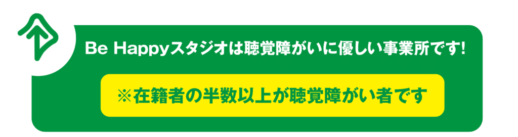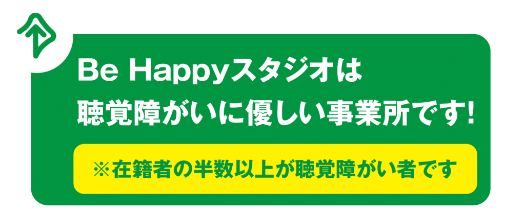 障がいのある方が自立し社会に参加するために就労することはより良い豊かな人生を送るうえで非常に大切なことだと私たちは考えています。「就職できるのか?」「仕事を続けることができるのか」と悩んだり、社会復帰に向けてのブランクなど不安を感じている方も少なくないと思います。BeHappyスタジオに入所した利用者のほとんどがそうでしたが、私たちと一緒に一つ一つを解決することで自分らしい働き方を見つけています。抱えている不安や悩みはそれぞれ違います。私たちはひとりひとりと向き合い、夢や目標のサポーターとしてあなたの働きたいという思いを支援します。
